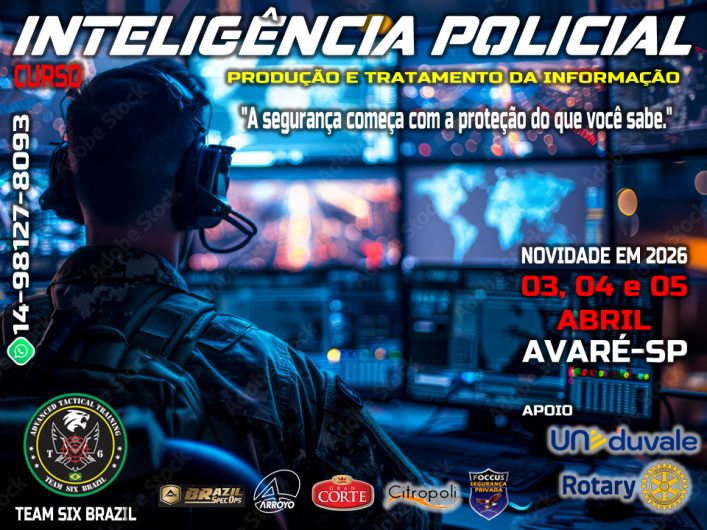 De 03 a 05 de abril, acontece em Avaré, o primeiro curso presencial da TEAM SIX BRAZIL de Inteligência Policial. Os alunos participantes terão a oportunidade de fazer um curso com nosso instrutor Ricardo Giovenardi, Dr na matéria, com especialização em diversos paises, incluive em Israel. As inscrições já encontram-se abertas, inclusive com valor promocional que inclui café da manha e almoço todos os dias e alojamento gratuito também. Informações pelo Whatsapp 14-98127-8093 com o Marcelo.
